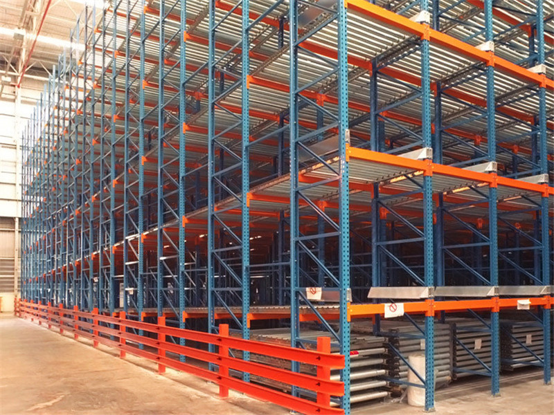重力式貨架又叫輥道式貨架,屬于倉儲貨架中的托盤類存儲貨架。重力式貨架是橫梁式貨架衍生品之一,貨架結構與橫梁式貨架相似,只是在橫梁上安上滾筒式軌道,軌道呈3-5°傾斜。托盤貨物用叉車搬運至貨架進貨口,利用自重,托盤從進口自動滑行至另一端的取貨口。重力式貨架屬于先進先出的存儲方式。